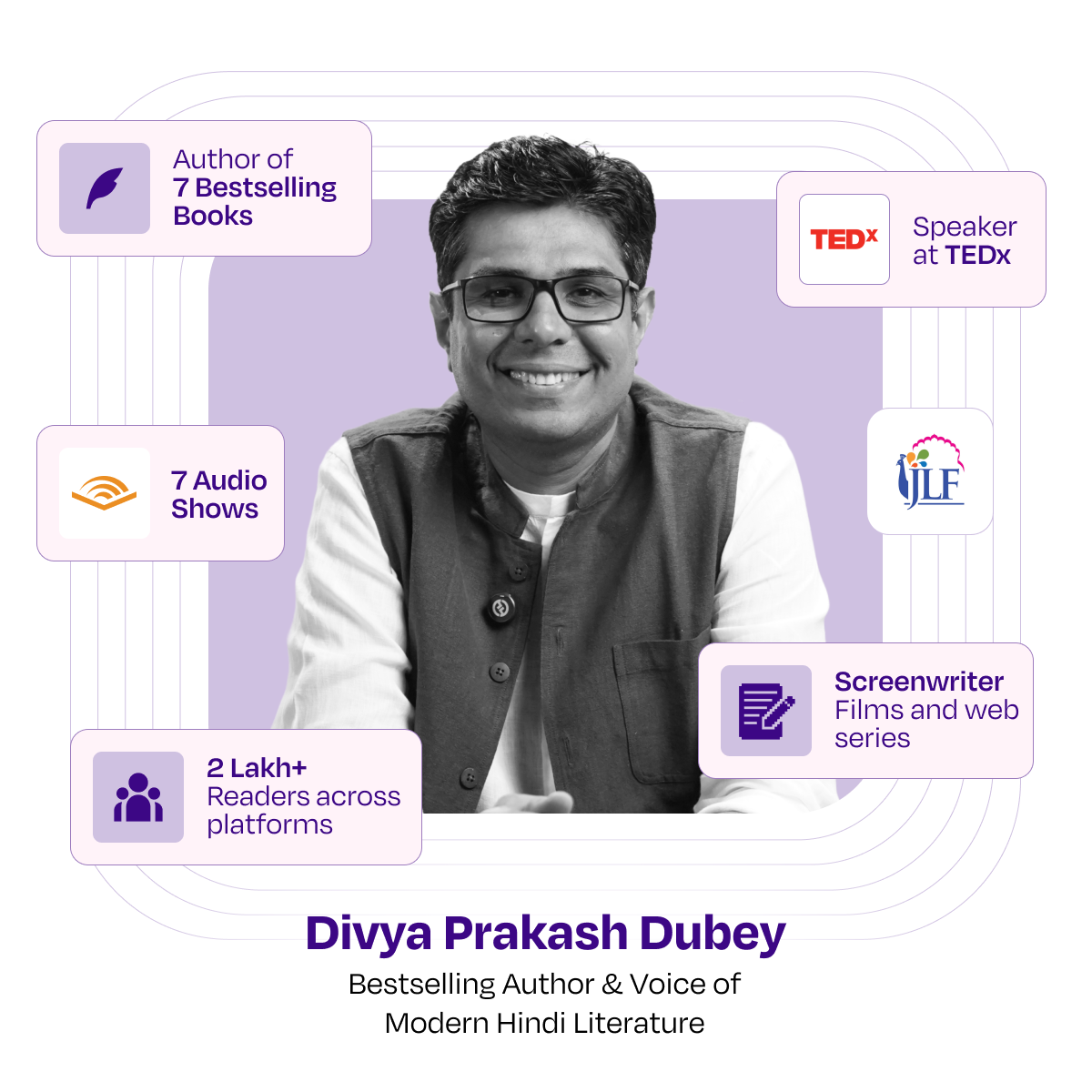 A bestselling author and voice of modern Hindi literature, Divya Prakash Dubey has redefined contemporary Indian storytelling with his unique blend of simplicity and emotional depth. His acclaimed works, including Musafir Café, October Junction, Ibnebatuti, and Masala Chai, have resonated with readers nationwide. Transitioning from a successful corporate career, Divya has also contributed dialogues to notable films and web series, showcasing his versatility across mediums. With over a decade of experience, he brings a wealth of knowledge and insight to this course, aiming to guide aspiring writers in finding their unique voice and telling their stories with authenticity and confidence.